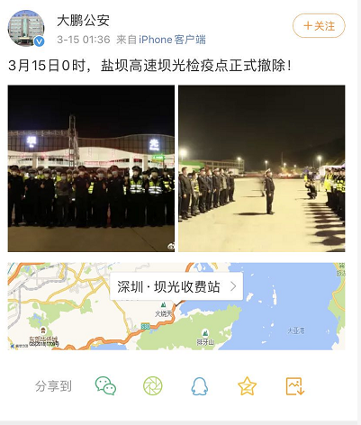 3月15日,深圳撤销全部49个入深车辆道路交通联合检疫点,各条入深道路恢复正常通行。