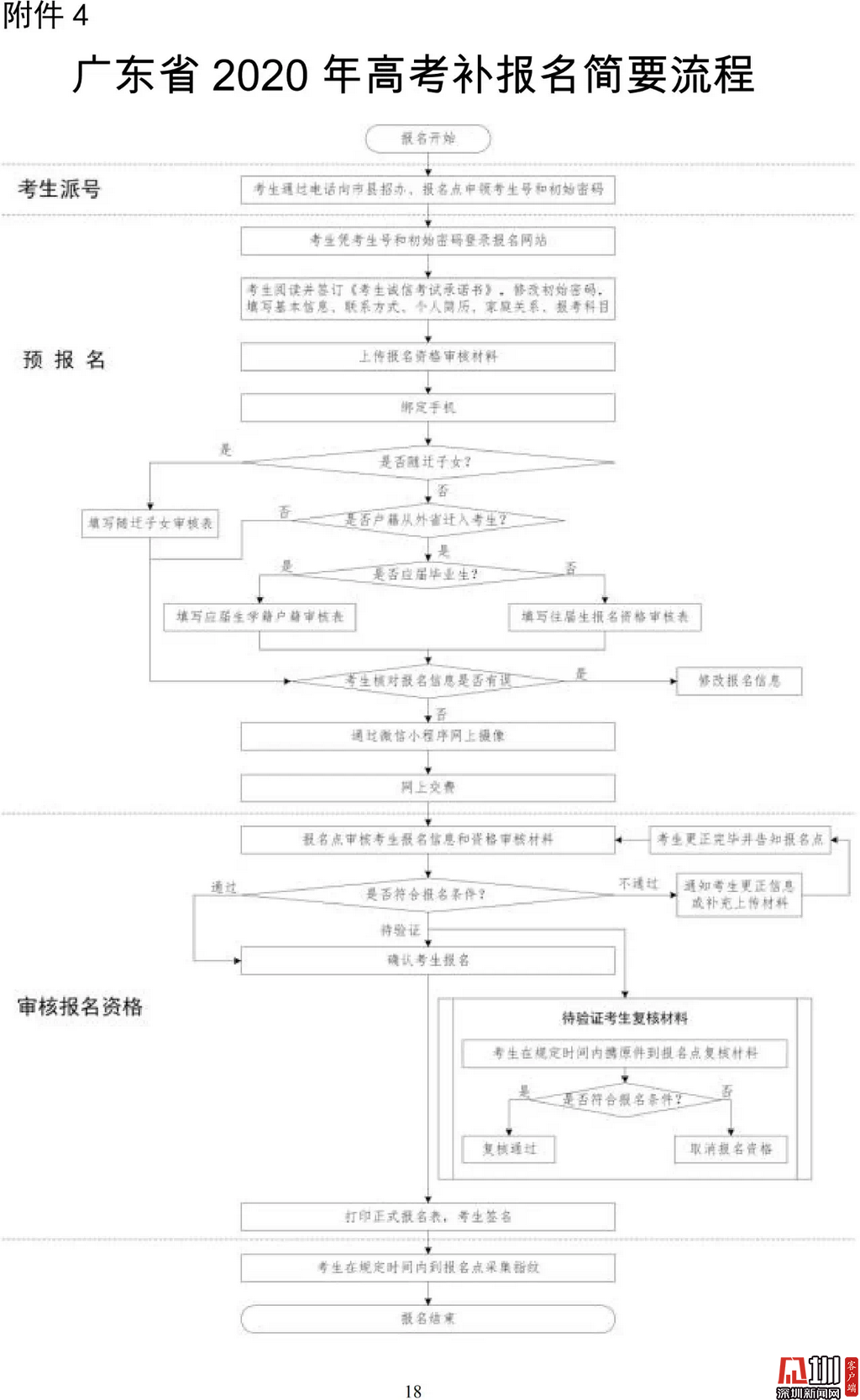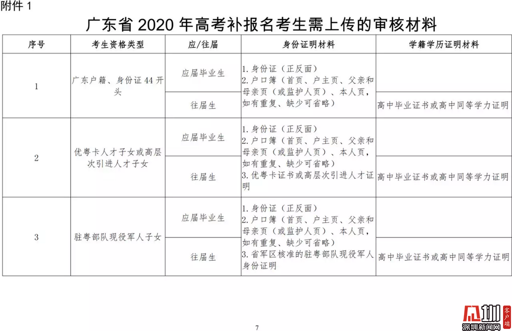 见圳客户端·深圳新闻网2020年3月19日讯(见圳客户端、深圳新闻网记者 金洪竹)3月18日,记者从广东省招生委员会办公室获悉,为满足退伍军人、运动训练及武术与民族传统体育考生、高职院校自主招生考生等符合我省高考条件,因各种原因尚未参加高考报名人员的需求,经研究决定安排一次高考补报名,补报名时间为3月23-26日。同时,为确保考生和考试工作人员的生命安全和身体健康,减少聚集,本次高考补报名采取先线上办理、后补验材料的方式进行。