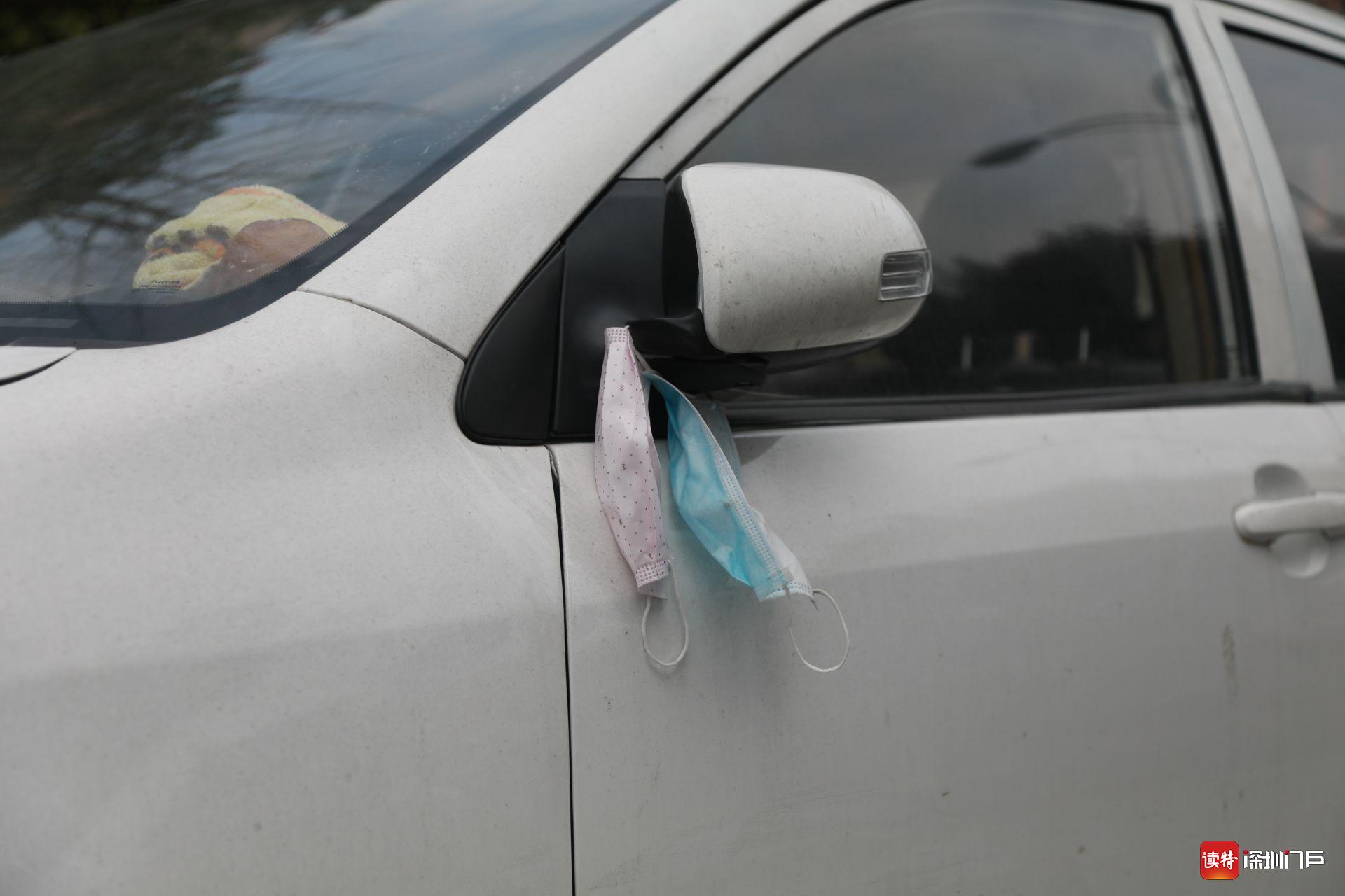 2月25日,监利,某小区门口停在路边的私家车,后视镜上挂着两只早已被遗弃的口罩。