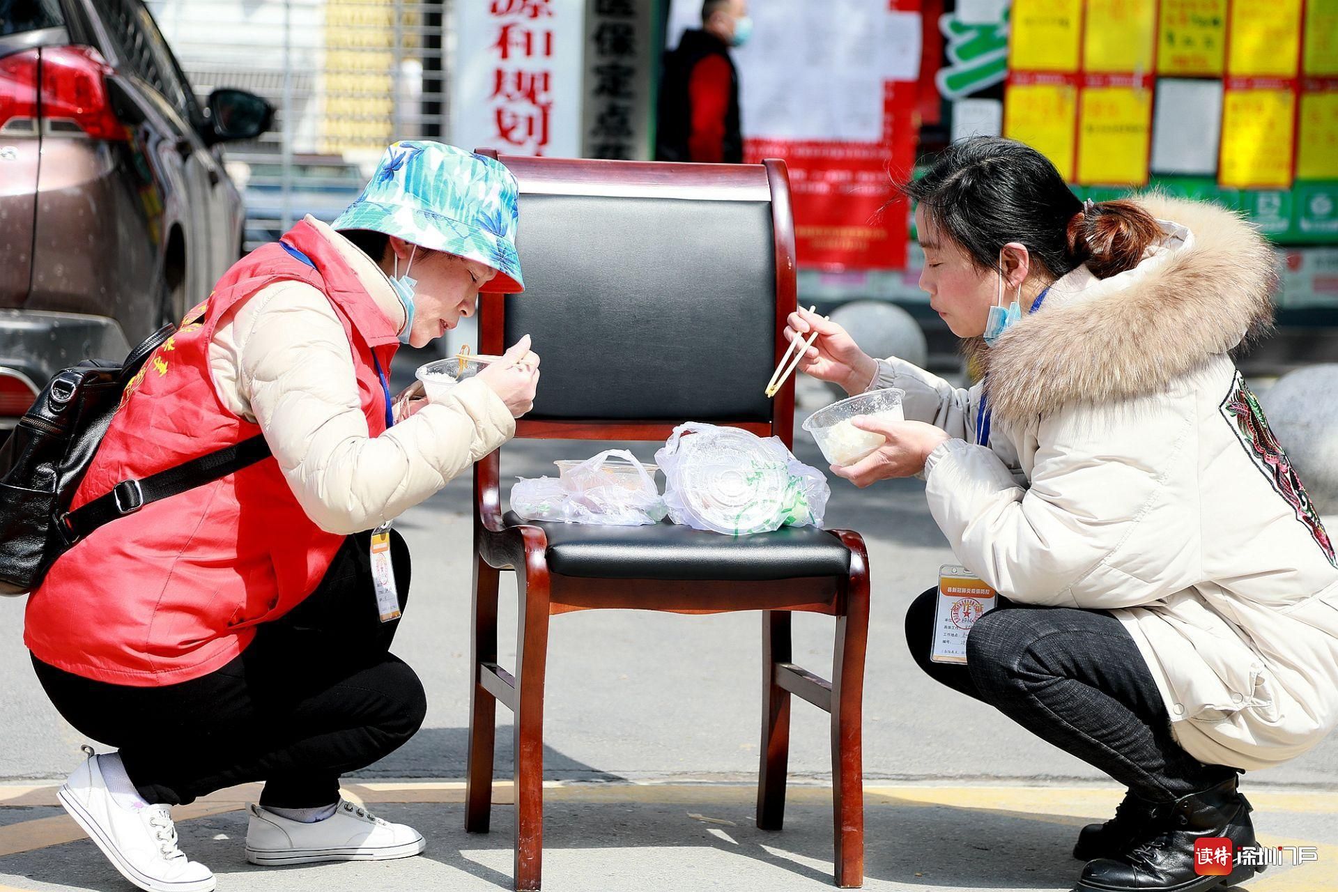 3月7日,监利,在街头执勤卡点吃饭的社区工作人员。