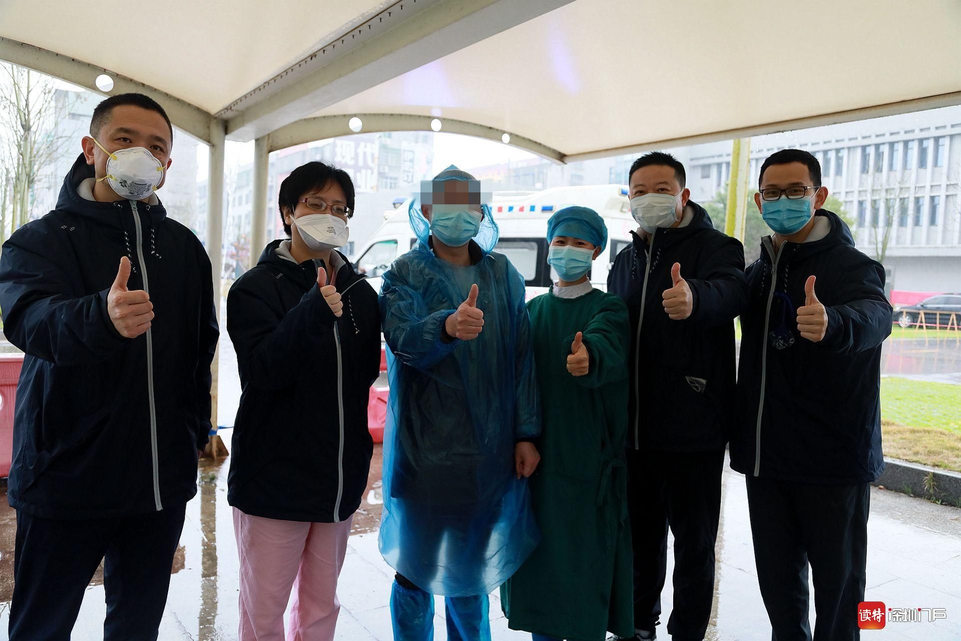 3月8日,监利县首例新冠肺炎重症患者张建(化名,中)治愈出院后与深圳医疗队医护人员合影留念。