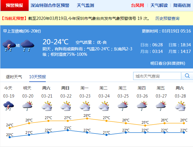 当前,深圳已进入强对流天气多发季节。未来几日天气是否平稳?据市气象台预测,19日深圳有雷阵雨,局部大雨,气温20℃至24℃;20日阵雨转多云;21日至24日湿度加大,气温逐日回升,天气转热,早晚有轻雾或雾。