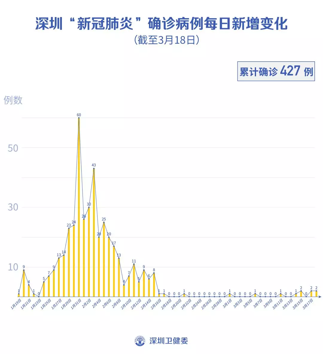 截至3月18日24时,深圳累计报告“新冠肺炎”病例427例。3月18日当天新增2例,出院4例。