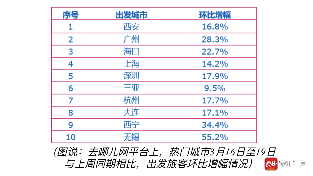深圳特区报2020年3月19日讯 进入3月中旬,随着各地有序复工复产,旅游行业也出现回暖迹象。去哪儿网数据显示,本周五一假期搜索量环比上周增长76%。