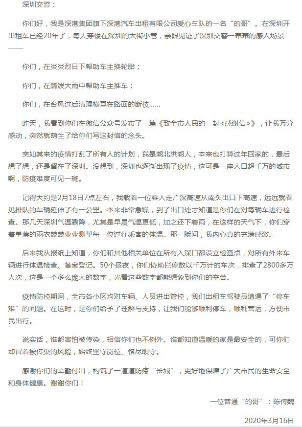 3月16日,深圳交警在微信公众号发了一封感谢信。