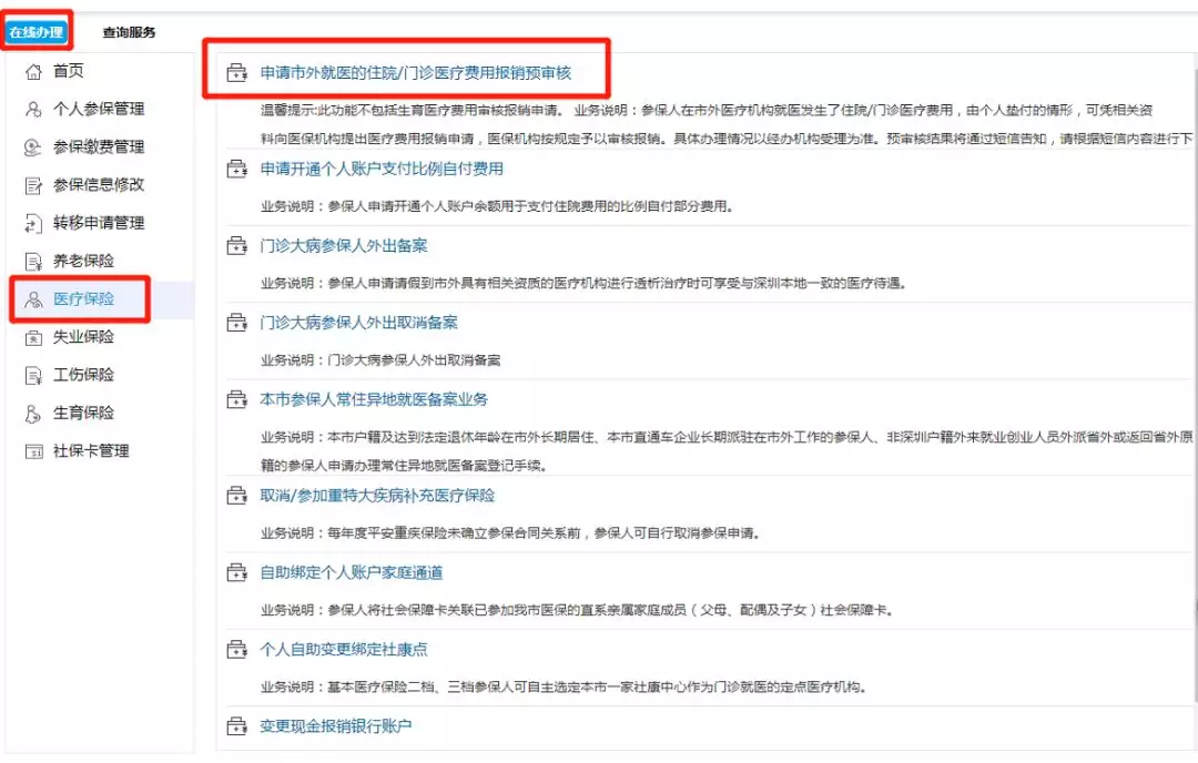 点击“在线办理”→点击“医疗保险”→点击“申请市外就医的住院/门诊费用报销预审核”