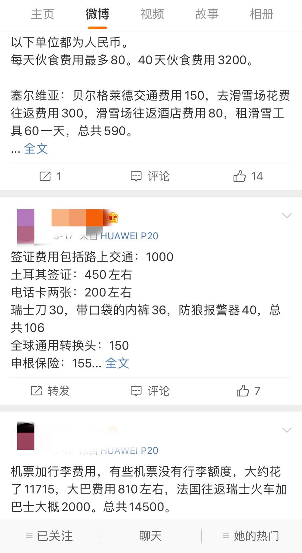 当事人在微博上公布的旅行费用
