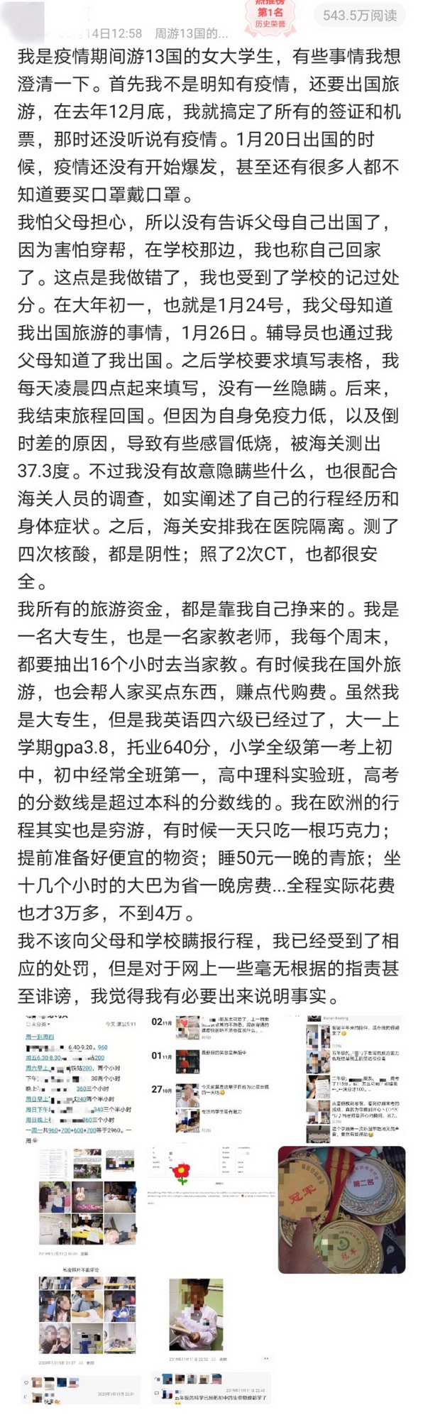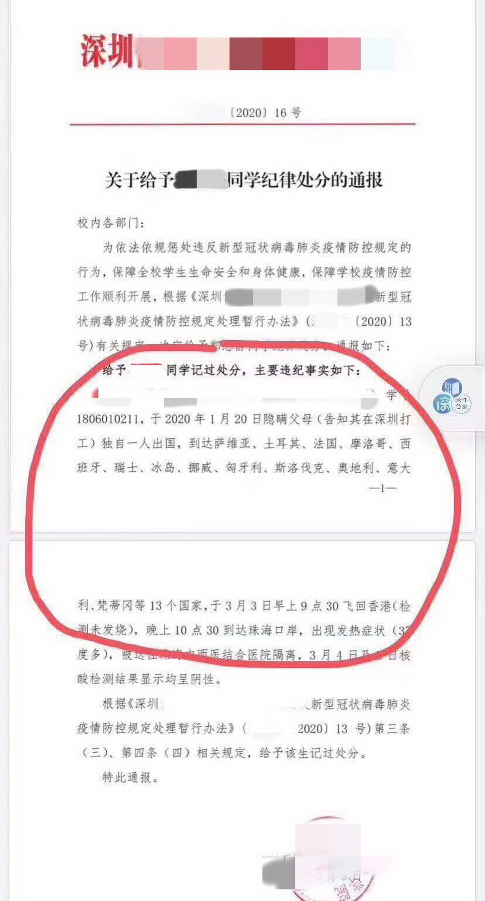 见圳客户端·深圳新闻网2020年3月20日讯 近日,一位深圳女大学生小Y瞒着父母出游13国,回国后因发热被隔离并因未如实向学校汇报行程被处分,此事引发社会关注。3月18日,当事人接受深圳新闻网记者采访,详述事件经过并表达悔意。