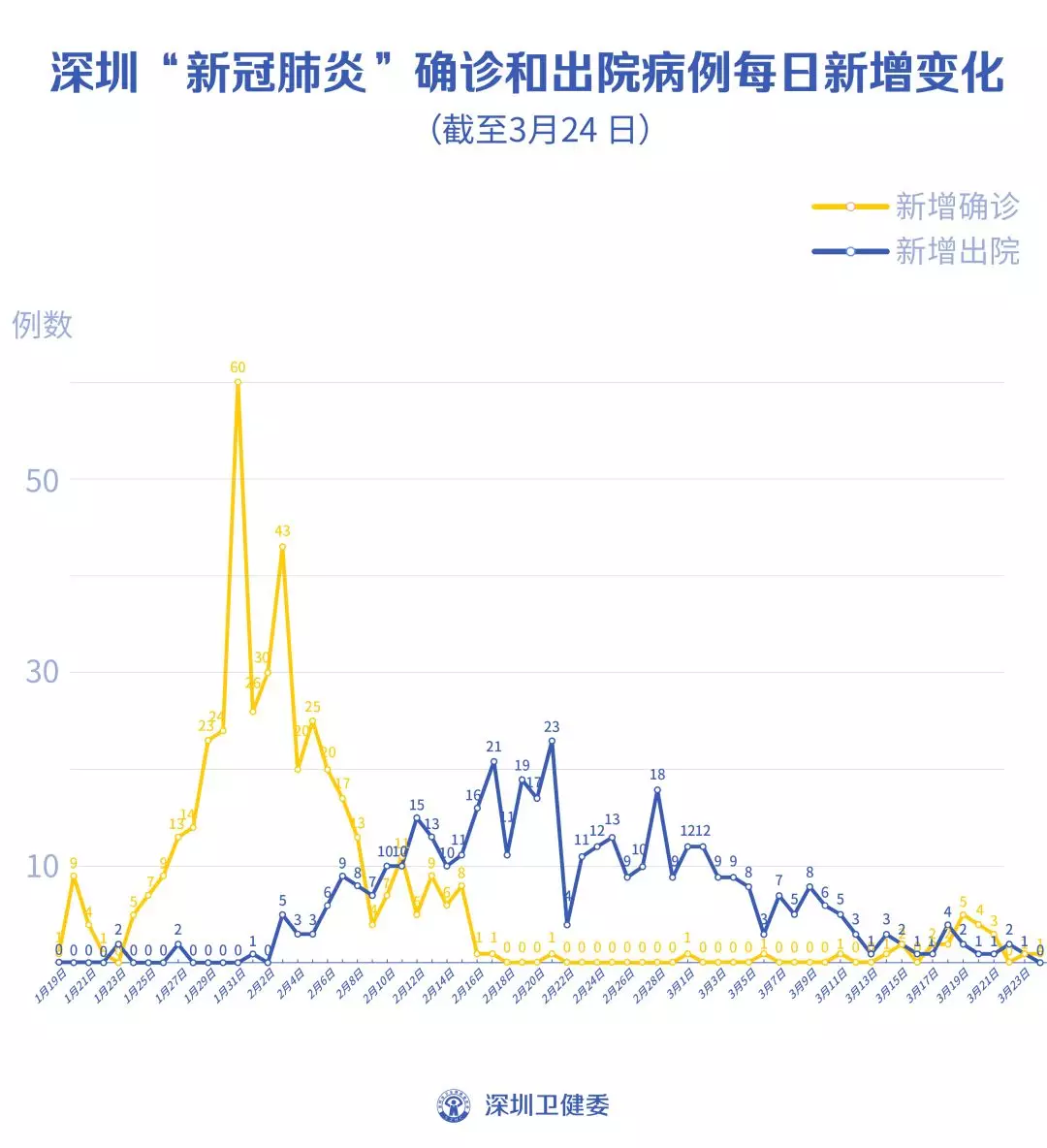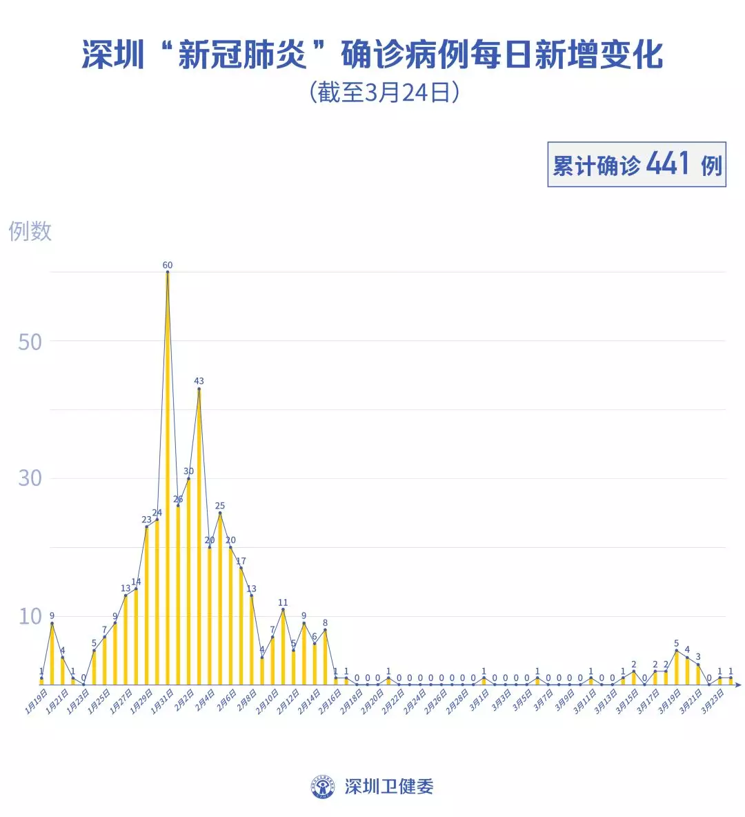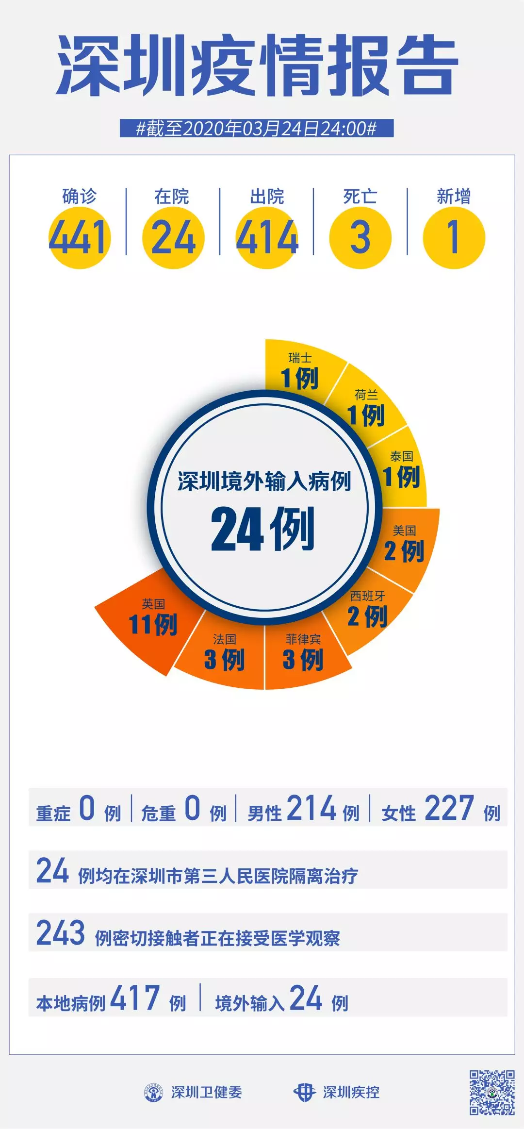 3月24日,深圳确诊1例境外输入“新冠肺炎”新病例,累计达24例。 病例24 男,31岁,巴西籍,在深圳工作,由英国返回。3月21日从英国伦敦乘坐SQ305航班飞往新加坡,22日从新加坡乘坐CZ3040航班飞往中国广州,当晚经广州白云机场入境,入境体温36.6℃。23日凌晨由专车送往深圳集中隔离观察,24日新冠病毒核酸初筛阳性,当天深圳市疾控中心复核亦为阳性。 目前患者已被转到深圳市第三人民医院隔离治疗。经初步判定,在中国内地有32名密切接触者,已集中隔离。 截至3月24日24时,深圳累计报告“新冠肺炎”病例441例。3月24日当天新增1例。 累计报告确诊病例中,男性214例、女性227例。 目前,死亡3例,累计出院414例。 24例确诊病例均在深圳市第三人民医院隔离治疗。 243名密切接触者正在接受医学观察。 资料来源:深圳市疾控中心、深圳市卫健委、广东省卫健委