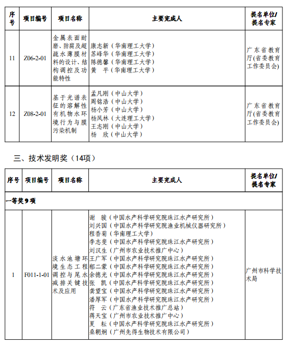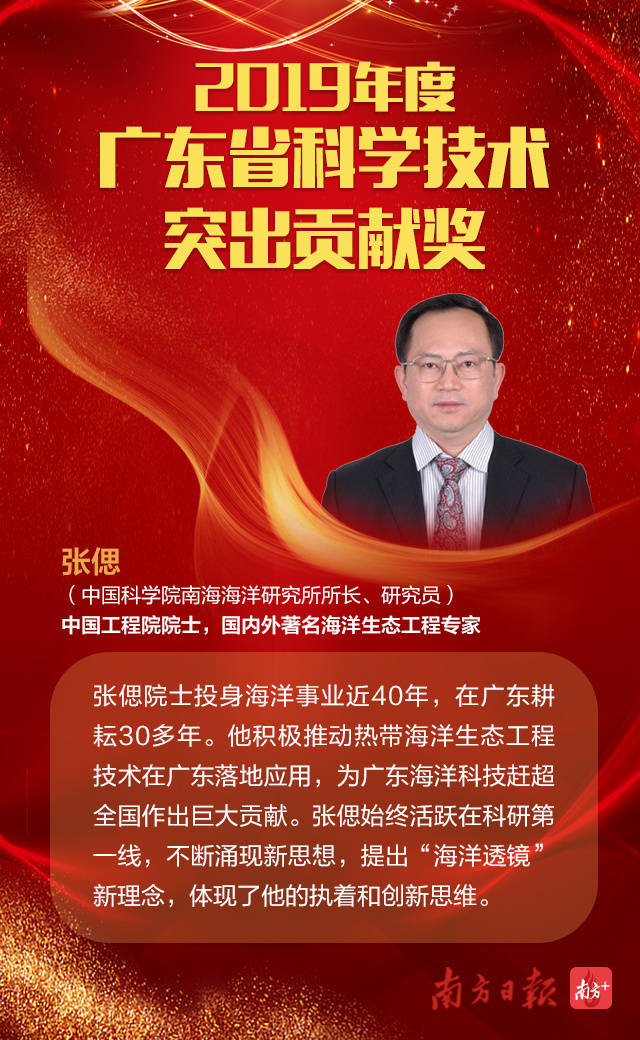 其中,2019年度广东省科学技术突出贡献奖的获奖者分别为:中国工程院院士、亚太材料科学院院士、华南理工大学教授王迎军;中国工程院院士,国内外著名海洋生态工程专家,中科院南海海洋研究所所长、研究员张偲。
