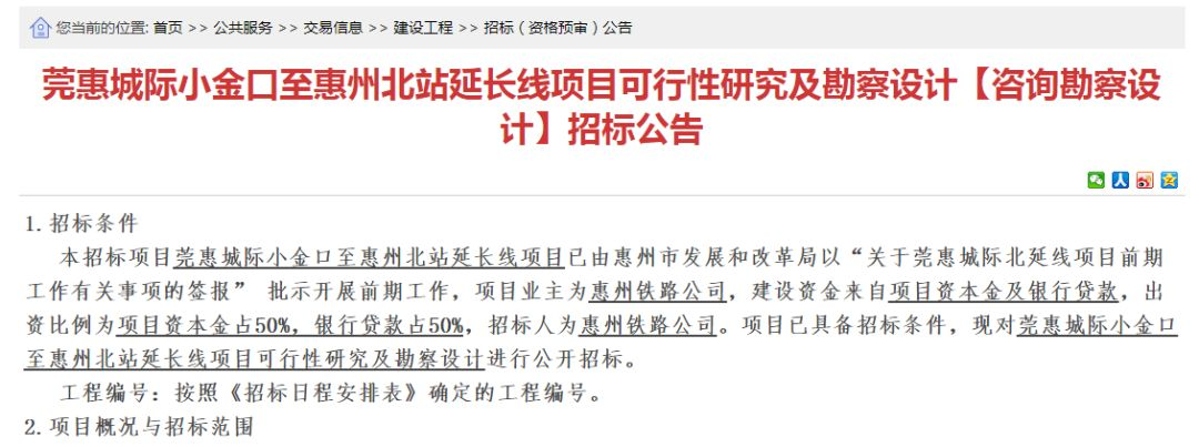 公告显示,莞惠城际小金口至惠州北站延长线正进行可行性研究及勘察设计招标,招标金额为7452.47万元(含税价)。