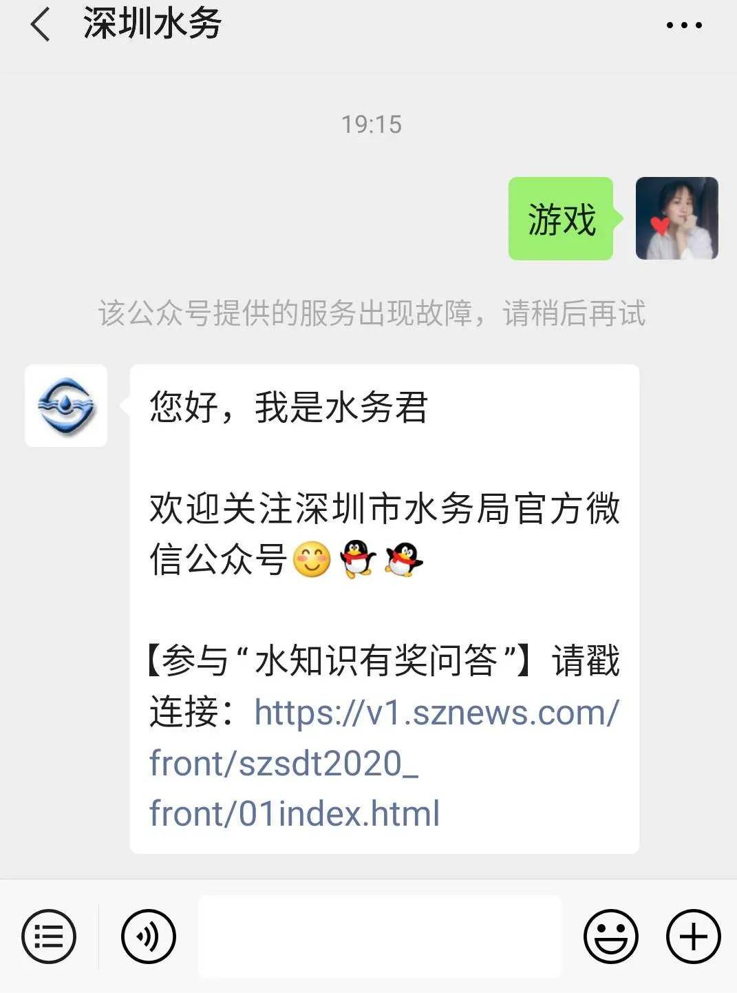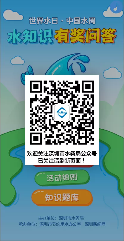 如果您已经关注了“深圳水务”,可以在公众号留言栏输入“游戏”、“答题”“红包”等关键词哦。