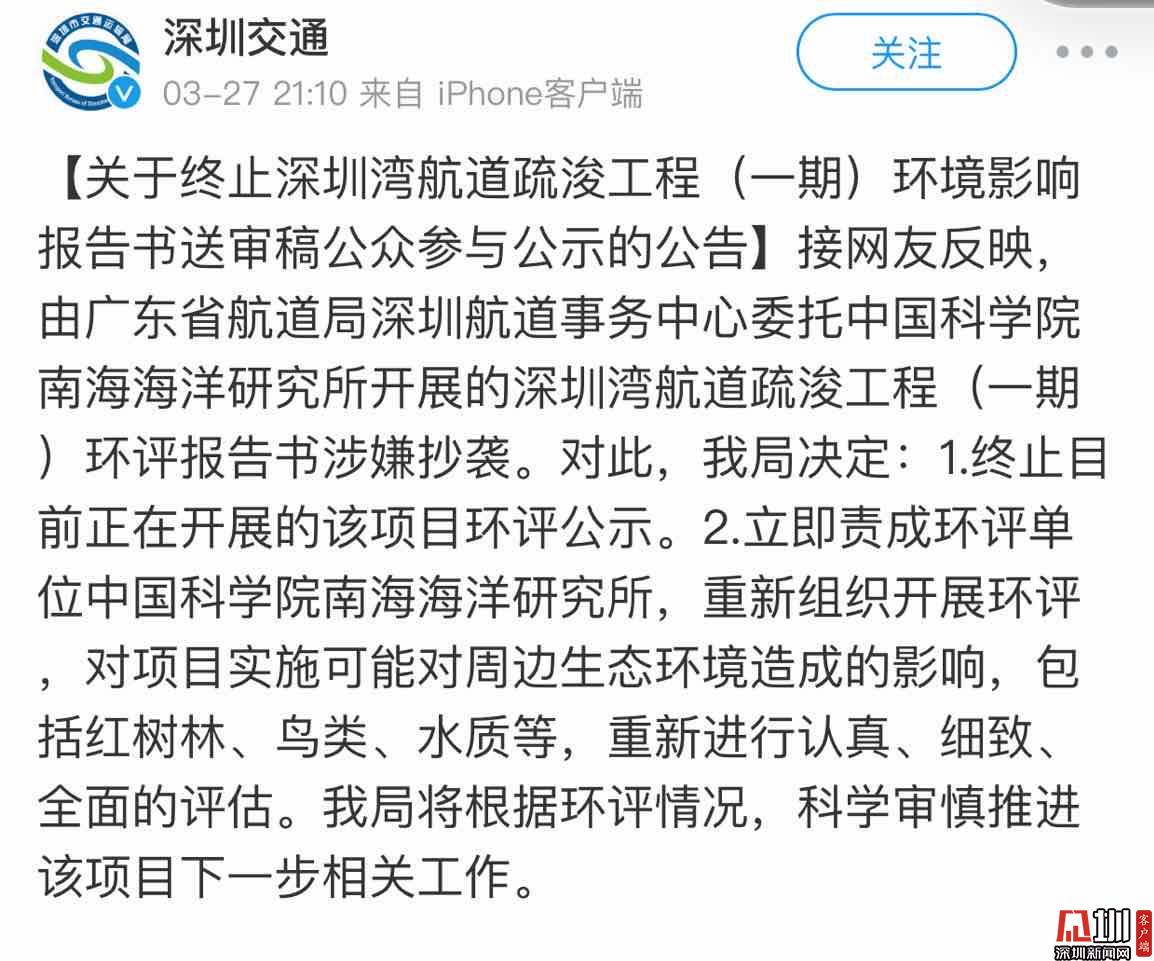 3月27日21时10分,深圳市交通运输管理局官方微博发布消息称:接网友反映,由广东省航道局深圳航道事务中心委托中国科学院南海海洋研究所开展的深圳湾航道疏浚工程(一期)环评报告书涉嫌抄袭。对此,深圳市交通运输管理局决定:1.终止目前正在开展的该项目环评公示。2.立即责成环评单位中国科学院南海海洋研究所,重新组织开展环评,对项目实施可能对周边生态环境造成的影响,包括红树林、鸟类、水质等,重新进行认真、细致、全面的评估。深圳市交通运输管理局将根据环评情况,科学审慎推进该项目下一步相关工作。