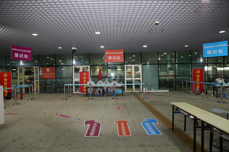 记者在现场看到,分拨转运点划分为蓝色、橙色、紫色区域,悬挂相应底色指示牌和张贴引导标识,工作人员逐一为旅客张贴代表不同目的地的蓝、橙、紫颜色胸牌,实行"三色区域、人区同色"的"颜色管理"。