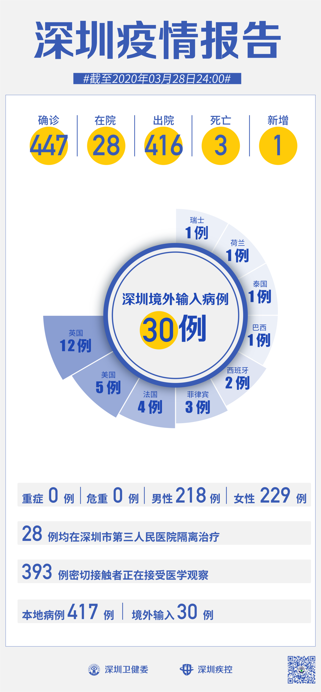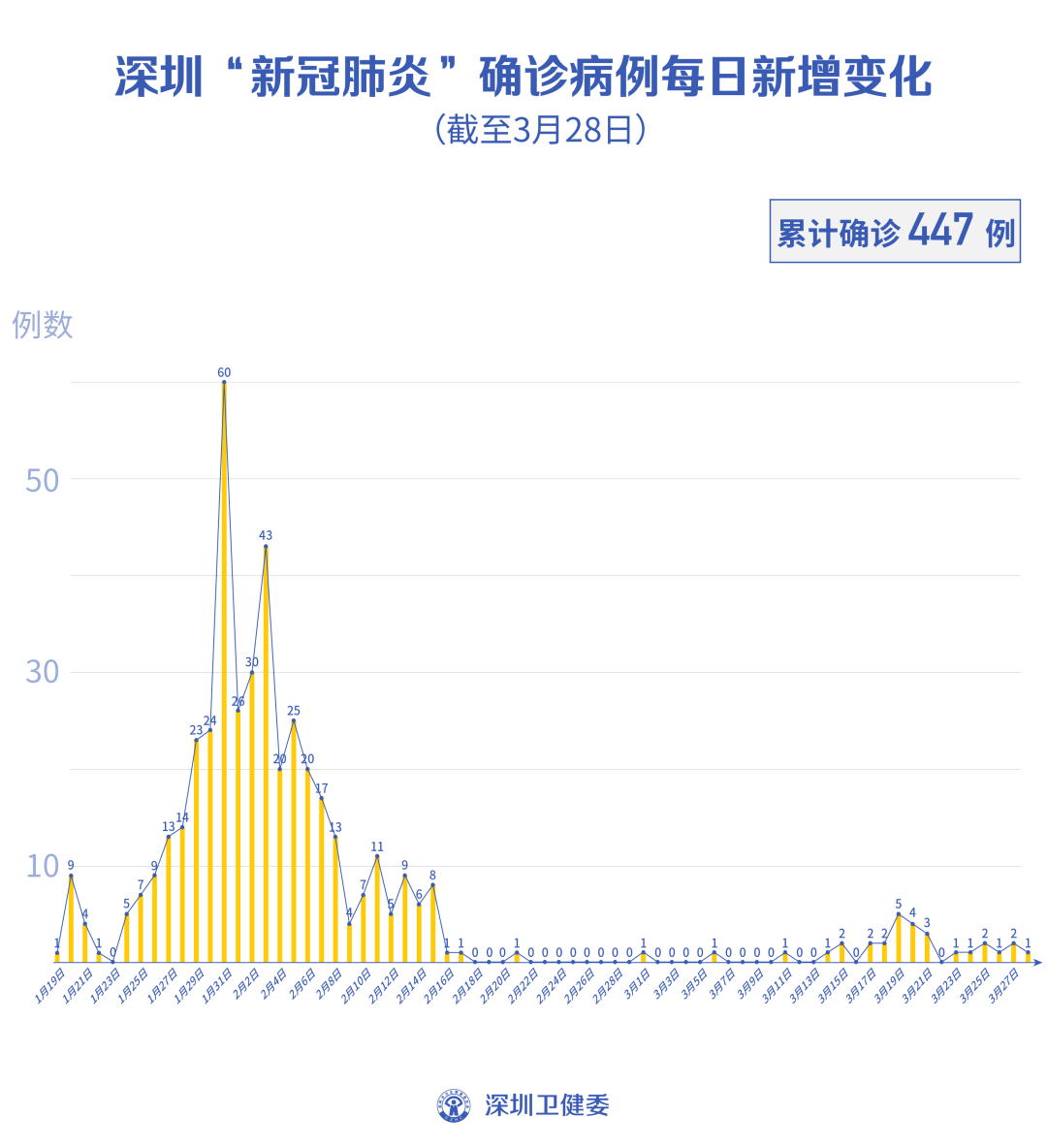 截至3月28日24时,深圳累计报告“新冠肺炎”病例447例。3月28日当天新增1例。