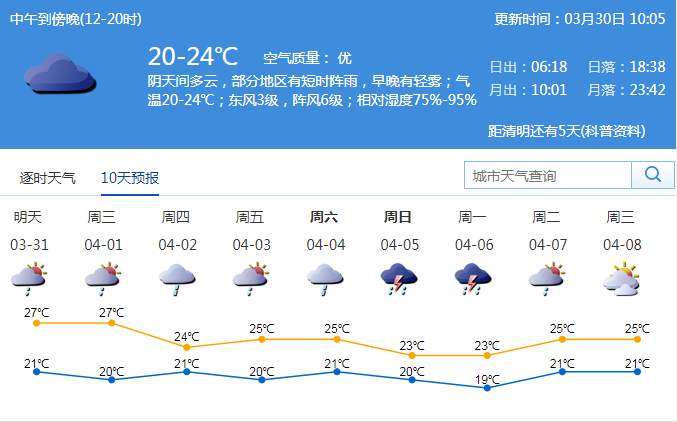 市气象台预测,31日至4月1日有阵雨或雷阵雨;2-3日多云到阴天,部分时间有分散小雨;展望清明假期期间,有明显降雨过程。注意雨雾天气低能见度对交通安全的影响。