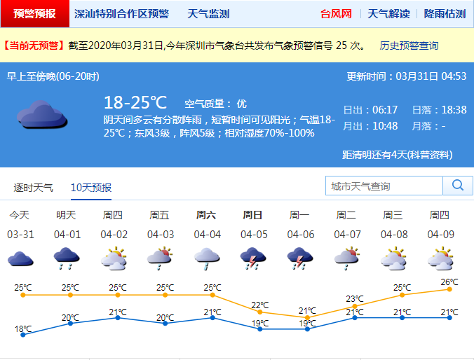 见圳客户端·深圳新闻网2020年3月31日讯 31日阴天间多云,有零星小雨和轻雾,气温19-25℃;1日至4月3日多云到阴天,部分时间有分散小雨和轻雾;4-6日有一次明显降雨过程。