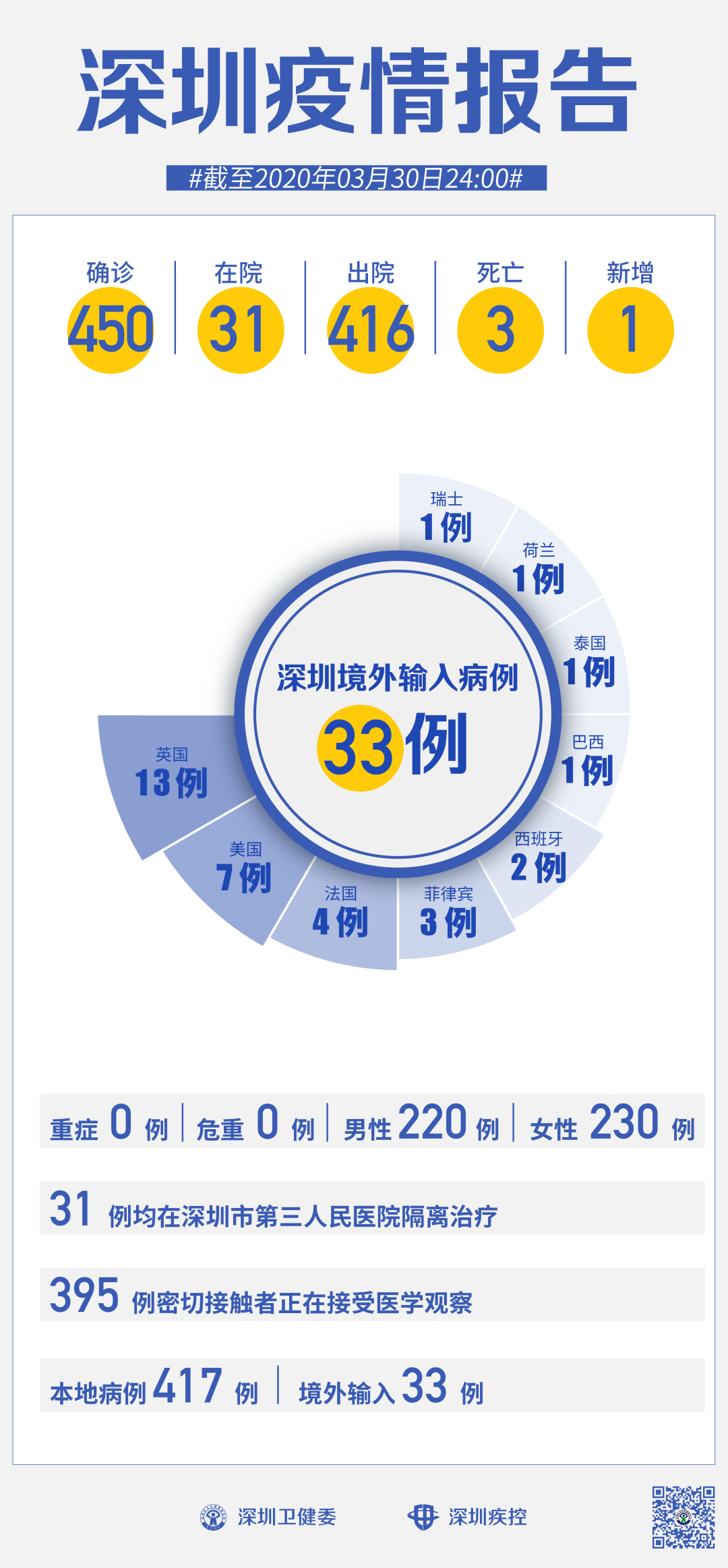 3月30日,深圳确诊1例境外输入“新冠肺炎”新病例,累计达33例。