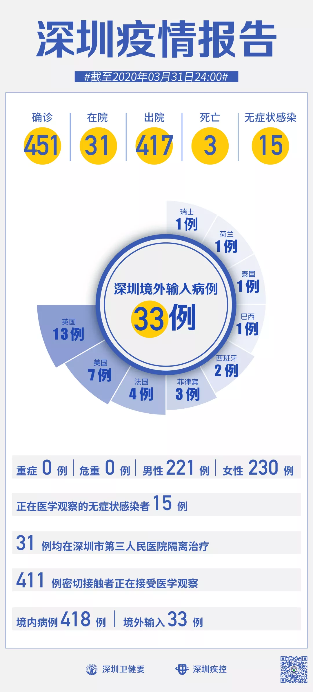截至3月31日24时,深圳累计报告新冠肺炎病例451例。3月31日当天新增境内病例1例、无症状感染者1例。