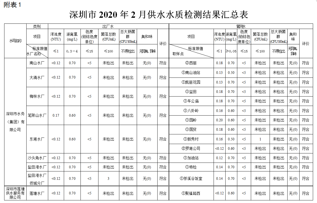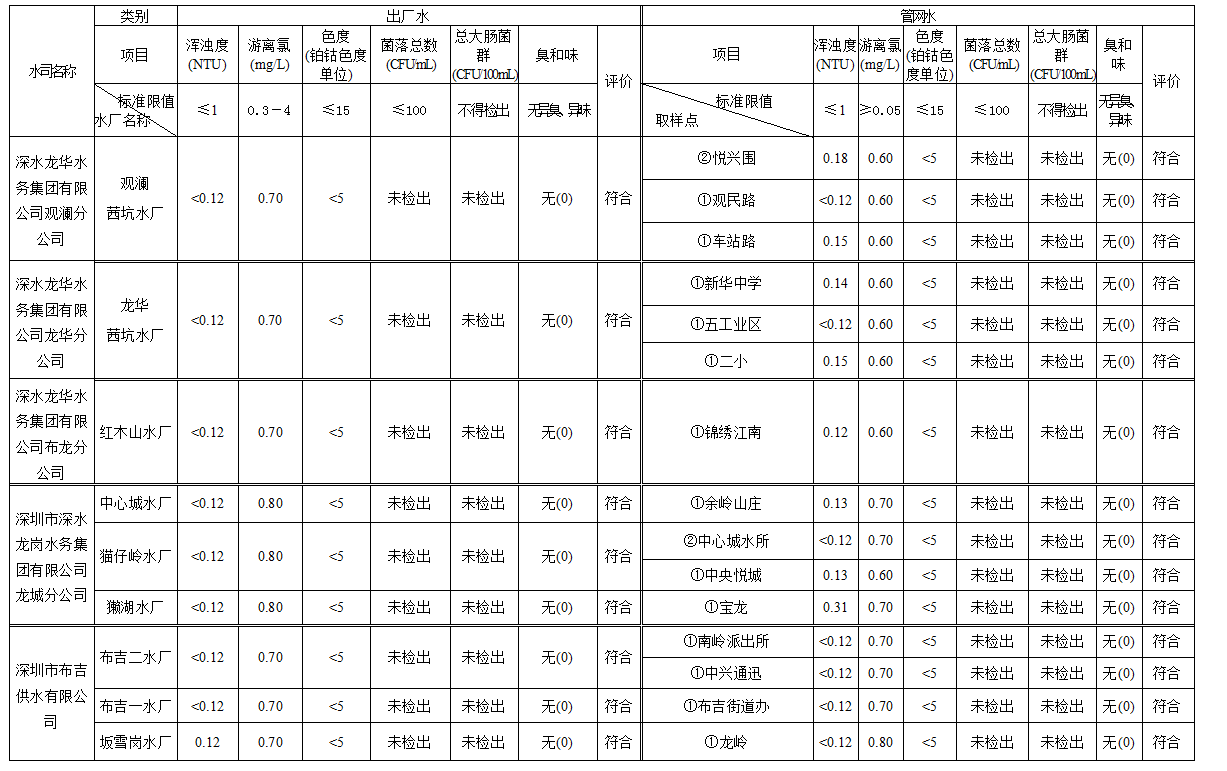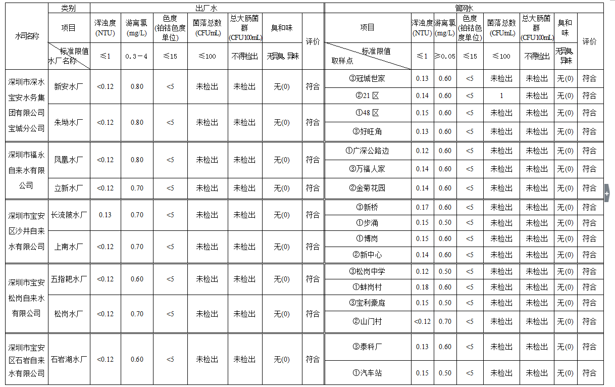 见圳客户端·深圳新闻网2020年4月4日讯(见圳客户端、深圳新闻网记者叶梅)2020年2月,深圳市水务局对全市42个水厂出厂水水样以及68个管网水水样进行了抽检。检测结果表明,依据GB5749—2006《生活饮用水卫生标准》,所有受检42个出厂水水样和68个管网水水样的浑浊度、消毒剂(游离氯或二氧化氯或总氯)、色度、菌落总数、总大肠菌群及臭和味共6项常规指标全部符合该标准的规定,出厂水水样合格率为100%,管网水合格率为100%。