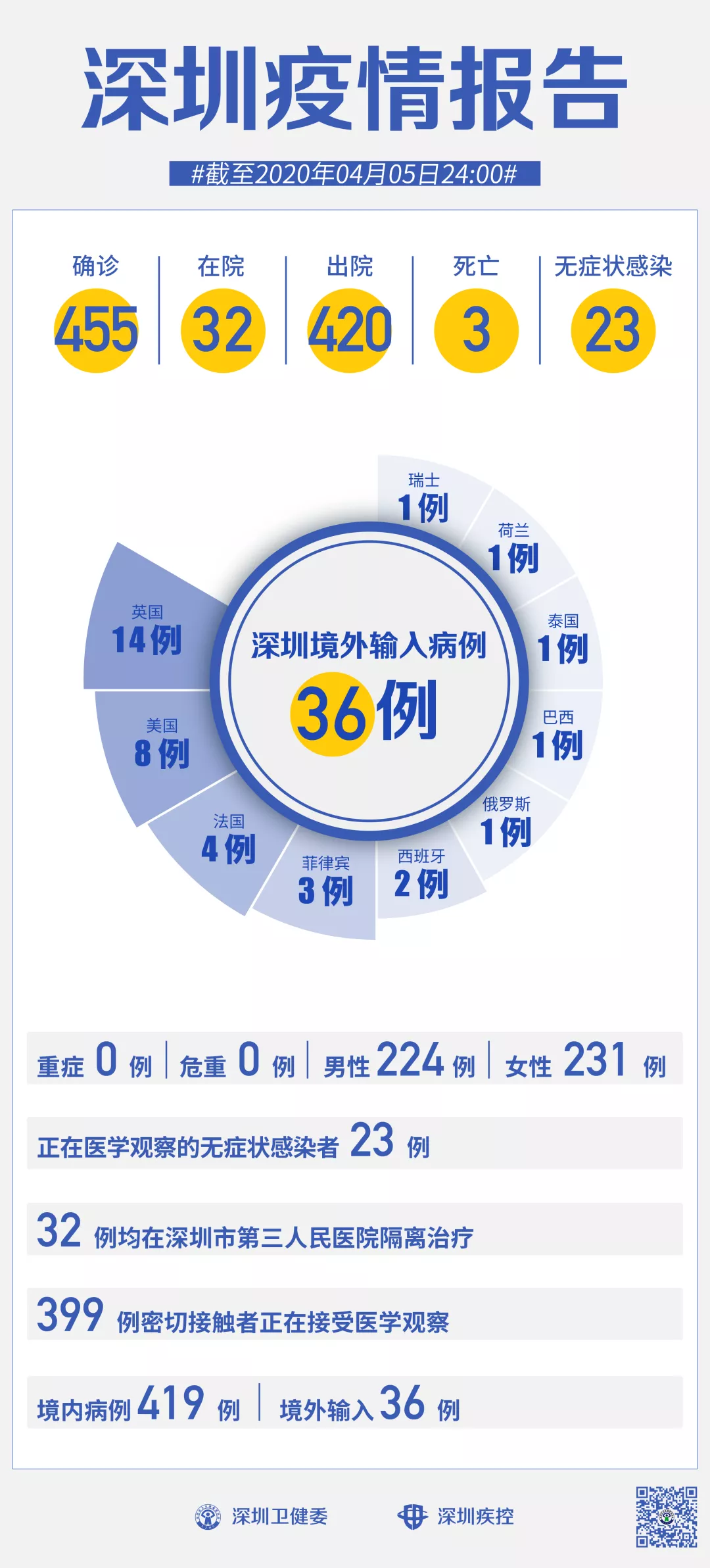 截至4月5日24时,深圳累计报告新冠肺炎病例455例。4月5日当天新增境内病例1例,新增无症状感染者2例,出院1例。