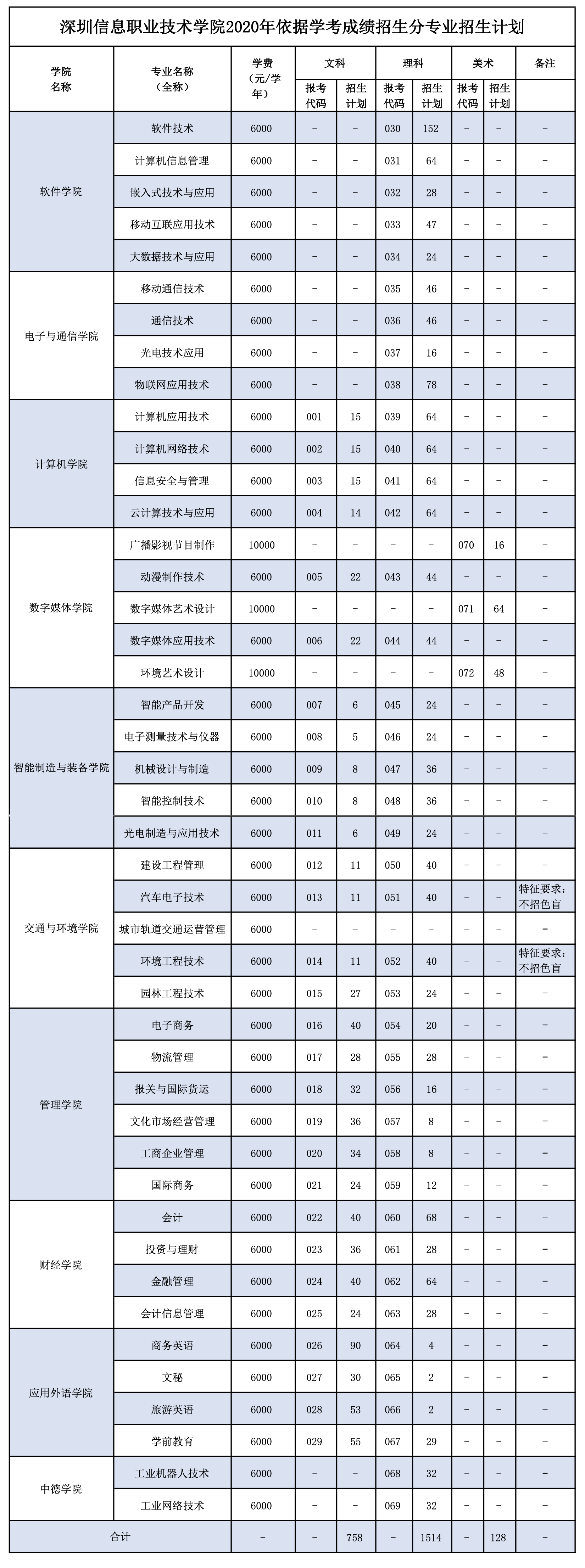 “依学考成绩录取”是深圳信息学院2020年春季高考招生重要形式之一,今年学校计划招生2400人,面向文科计划招生758人,理科计划招生1514人,美术计划招生128人。该校软件学院、电子与通信学院、计算机学院、数字媒体学院、智能制造与装备学院、交通与环境学院、管理学院、财经学院、应用外语学院、中德学院等10个学院均有招生计划,招生专业共43个。