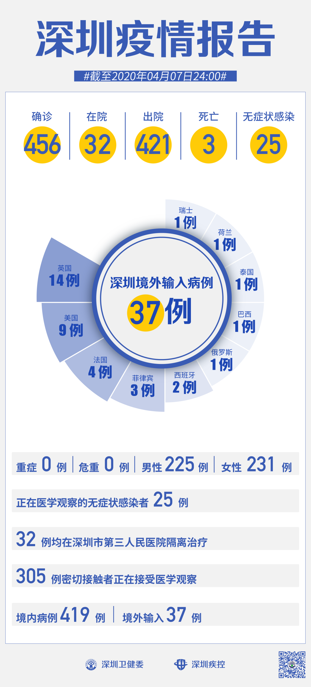 截至4月7日24时,深圳累计报告新冠肺炎病例456例。4月7日当天新增境外输入病例1例,新增无症状感染者1例,出院1例。