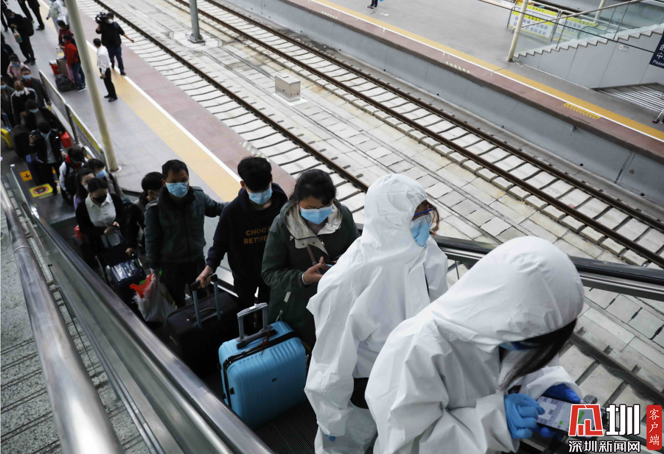 两位穿着防护衣的旅客正在出站。