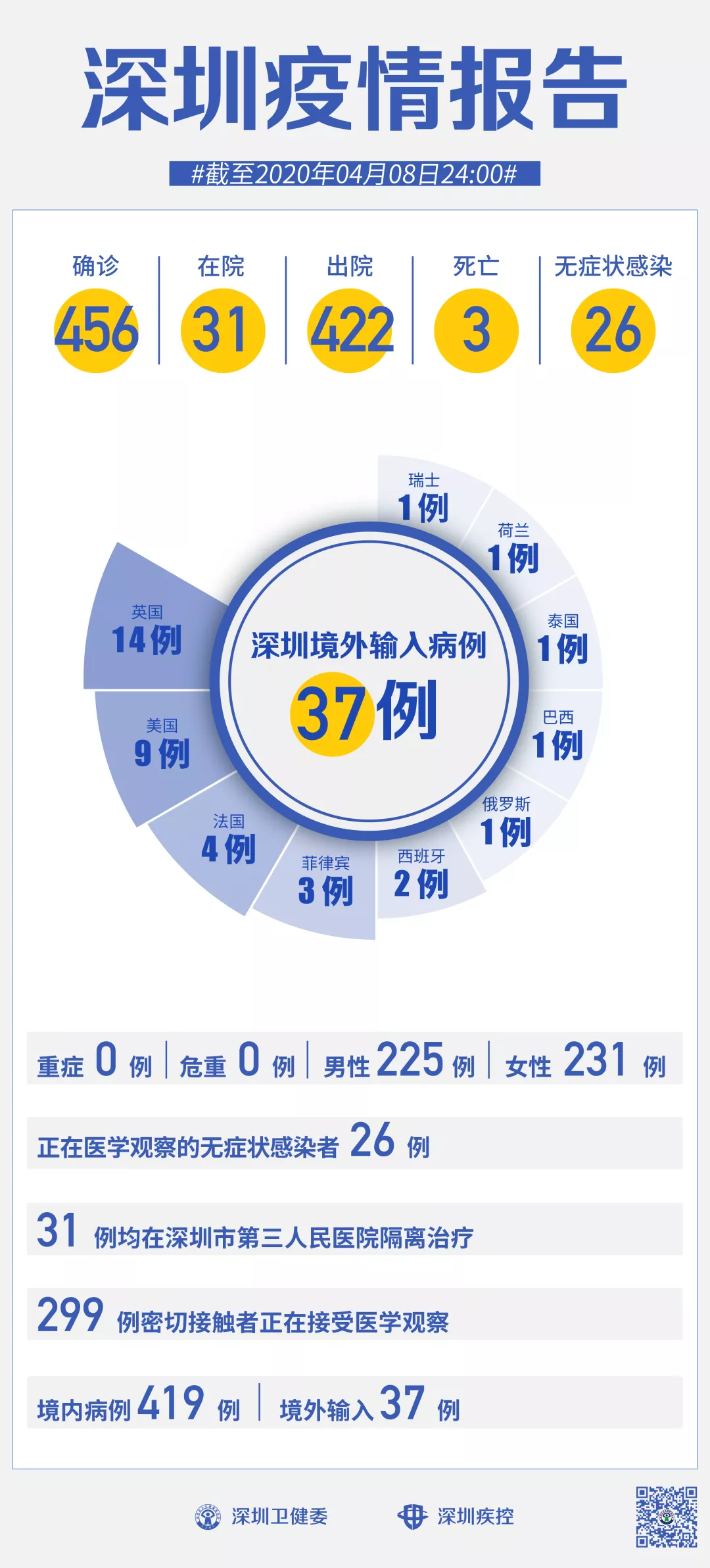 截至4月8日24时,深圳累计报告新冠肺炎病例456例。4月8日当天新增无症状感染者1例,出院1例。