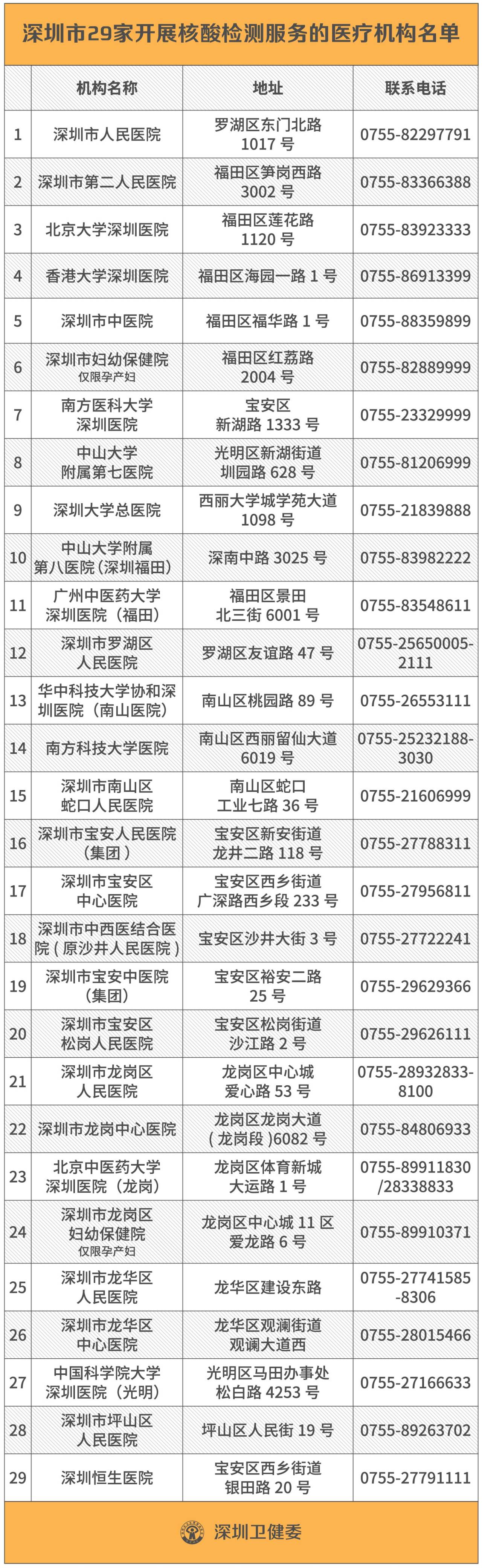 见圳客户端·深圳新闻网2020年4月9日讯(见圳客户端、深圳新闻网记者刘梦婷 通讯员深卫信)4月8日,武汉解封。但解封不等于解防,为了更好防控新冠肺炎,4月9日,深圳市卫健委公布29家面向公众开展新冠病毒核酸检测的医院名单,如果市民担心感染新冠肺炎,可前往检测。