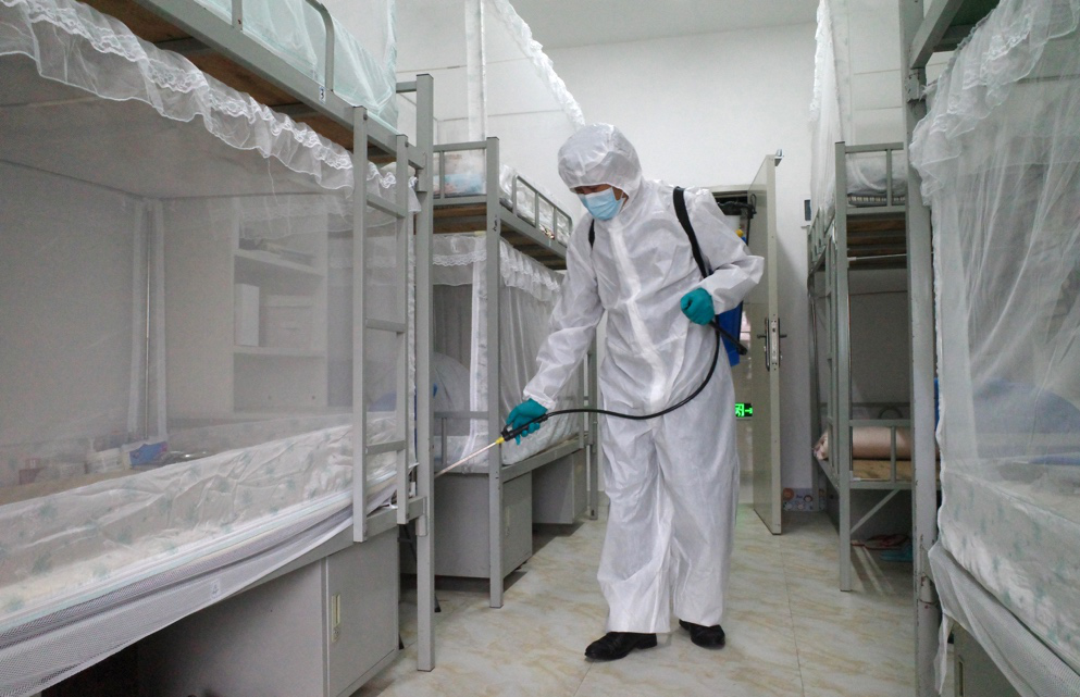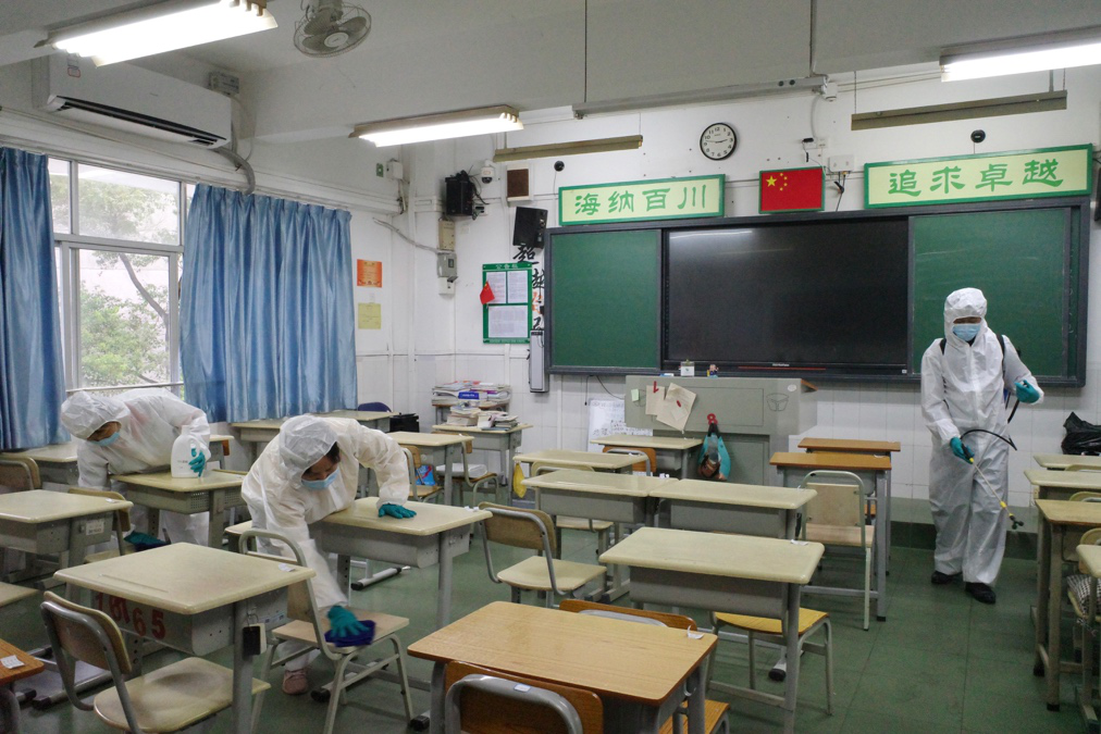 与此同时,为保障住宿生安全,翠园中学已对所有办公室、教室和学生寝室、电梯进行了全方位消杀,并在校园安装150多个水龙头,配备洗手液。在每栋楼设置了消毒卡片,每层楼增设口罩回收箱,每间教室安装紫外线灯,每天定时进行消杀工作。此外,学校还在每间寝室洗手间都配备了洗手液,张贴了“七步洗手法”标识。食堂间隔1米摆放单人单座,并在地面贴上“排队取餐、间隔1米”的脚印贴纸,取餐处贴有“请自觉保持距离”“请勿面对面就餐”等标识。