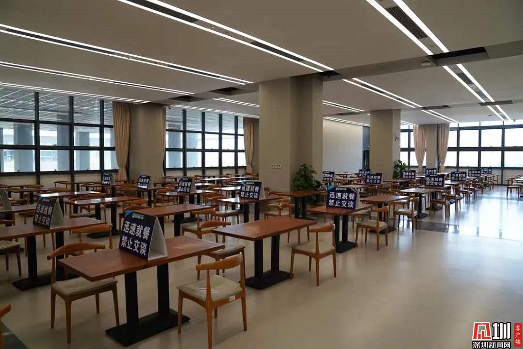 食堂就餐方面,深技大采取定点分时错峰供餐制,引导师生排队候餐时保持1米以上距离。计划配置几款固定套餐在窗口供应,并设置盒饭售卖区,师生可即取即走,以多种方式减少排队选餐时间及用餐区人员聚集。食堂就餐区现已设置间隔标识,保证就餐距离,并配置了洗手液和消毒酒精等物品。开学后,学生食堂实行单向出入,严格划分出入路线,由北侧门进入、送餐具回收后从南侧门离开,减少人员往返交叉。
