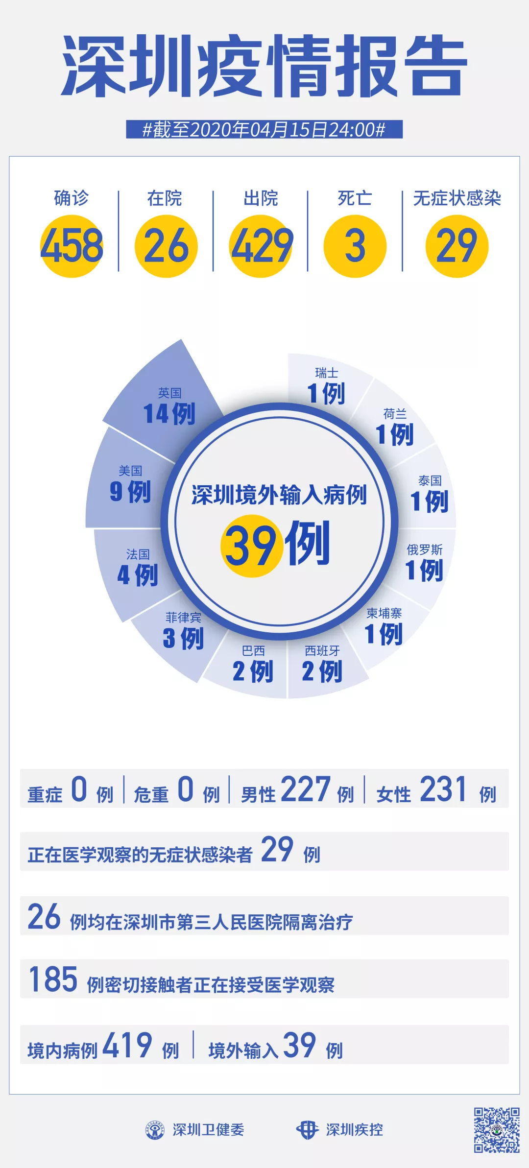 截至4月15日24时,深圳累计报告新冠肺炎病例458例。4月15日当天新增出院2例。