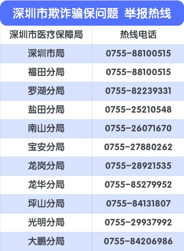 市医保局已在深圳市各区设立投诉举报电话,欢迎广大市民共同参与医保基金监督管理。市民可通过实名举报和匿名举报方式检举、揭发欺诈骗保行为,经查证属实的,将根据《深圳市欺诈骗取医疗保障基金行为举报奖励实施细则(试行)》对举报人予以奖励,奖金最高可达10万元!(记者 庄瑞玉)