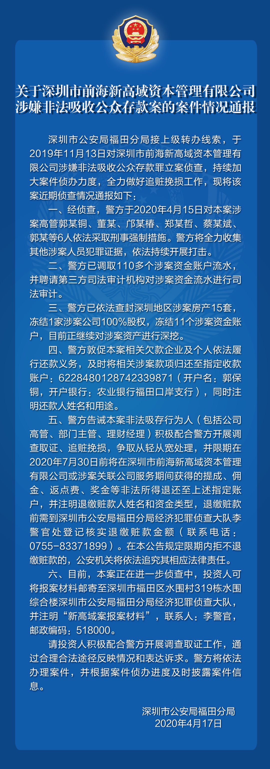 关于深圳市前海新高域资本管理有限公司涉嫌非法吸收公众存款案的案件情况通报