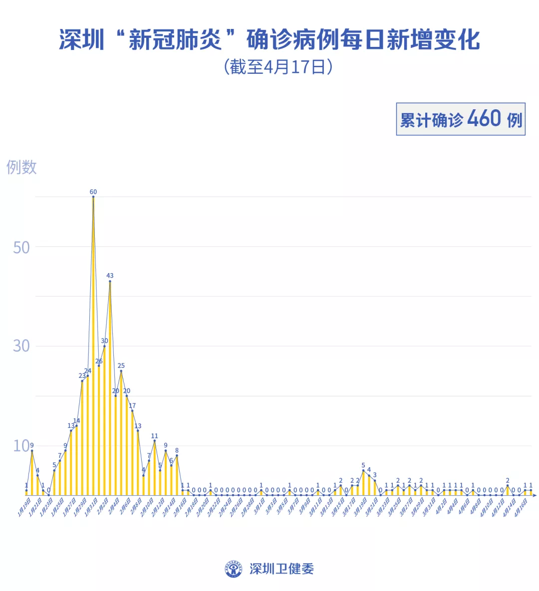 截至4月17日24时,深圳累计报告新冠肺炎病例460例。4月17日当天新增境内病例1例。