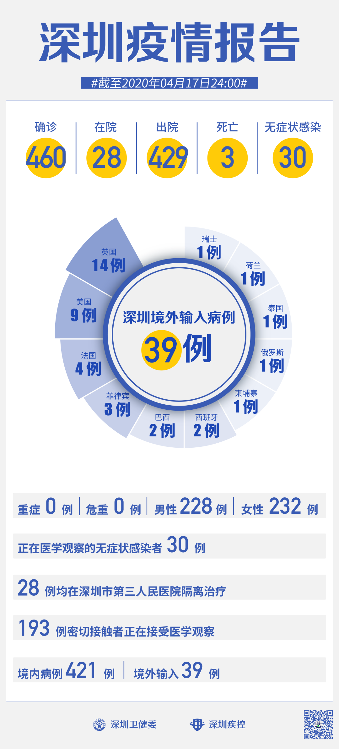 截至4月17日24时,深圳累计报告新冠肺炎病例460例。4月17日当天新增境内病例1例。