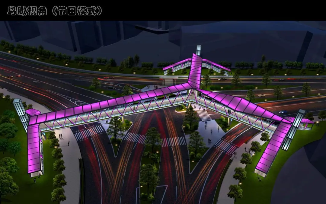 项目位于南山区东滨路与南山大道交叉口处,采用三个方向主梁互为120°交角的“Y”形方案。主梁总长163米,采用连续钢箱梁,梯道采用钢结构。主桥每个端部均设置2座钢结构梯道和1部垂直电梯。