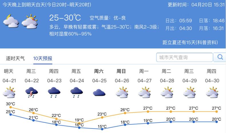 见圳客户端·深圳新闻网2020年4月20日讯(见圳客户端、深圳新闻网记者 陈婕)深圳20日最高气温30℃以上,其中龙岗区坪西站记录到33.9℃的全市最高气温,可以说拥有了标配的“夏季气温”,但冷空气已带着“空调”在路上了,预计22日抵达深圳,所以外套、厚被子先别急着收!