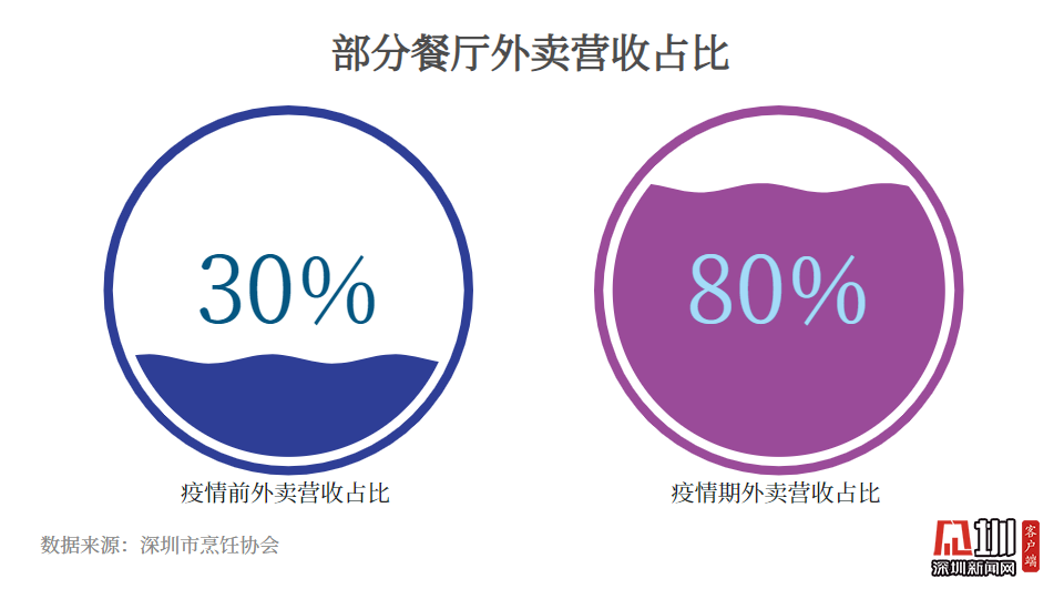 大秦小宴、云海肴……深圳餐饮行业靠外卖实现“突围”。根据深圳市烹饪协会的数据,在疫情期间,部分餐饮店的外卖营收额占比增长了200%,一些过去不提供外卖服务的商家,如传统大酒楼、米其林餐厅、五星级酒店等,为了创收,也加入到了外卖平台。“以前外卖营收能占总收入30%就算不错的,疫情期部份餐厅已经占到收入的80%甚至90%。”深圳市烹饪协会常务副会长刘永忠介绍。