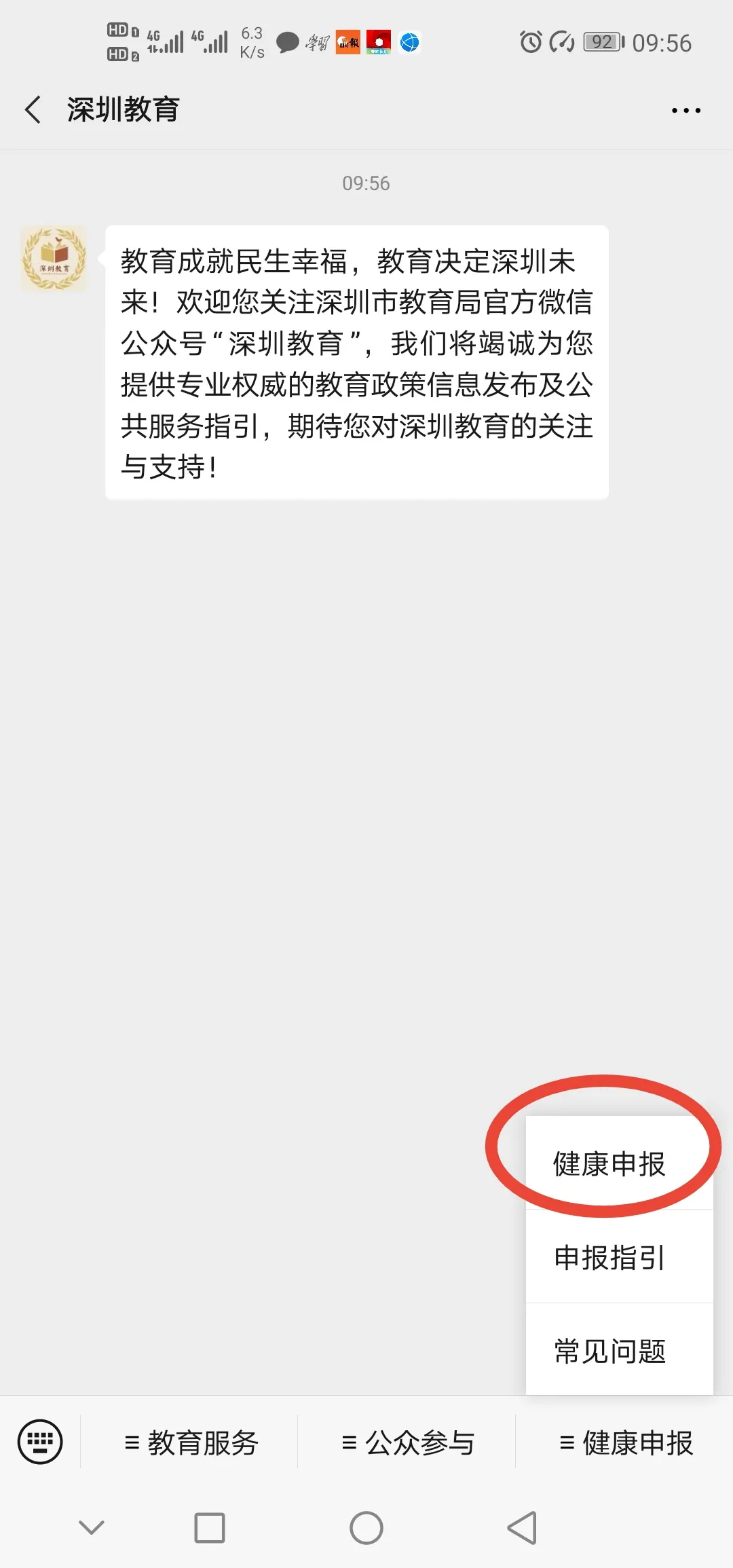 微信关注“深圳教育”微信公众号,点击底部菜单栏“健康申报”即可申报。
