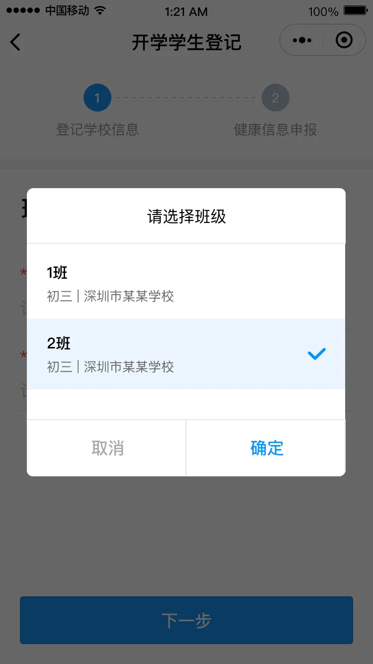 进入“开学学生登记”页面,点击“马上登记”进入登记界面,填写班主任姓名和手机号码后点击“下一步”,请选择对应的班级,进入健康申报卡界面。