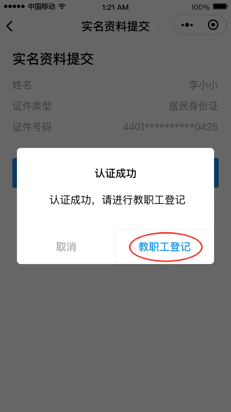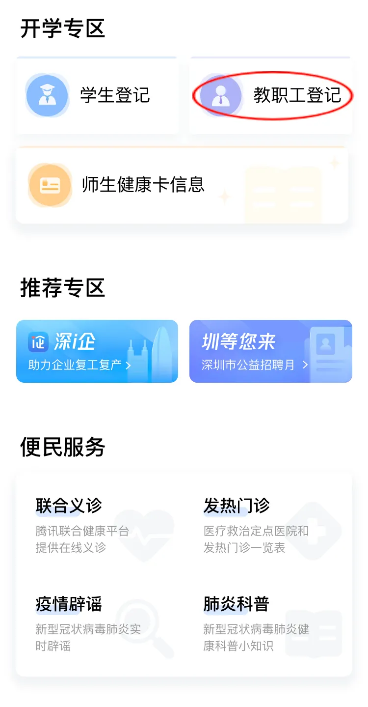 在开学专区,点击“教职工登记”进行自主申报和实名认证。