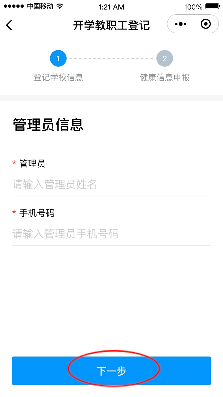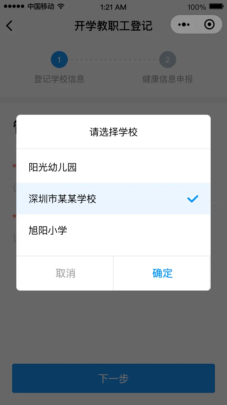 点击“马上登记”进入登记界面,填写学校管理员姓名和手机号码(学校管理员姓名和手机号码请询问学校获得),点击“下一步”,请选择对应的学校,进入健康申报卡界面。
