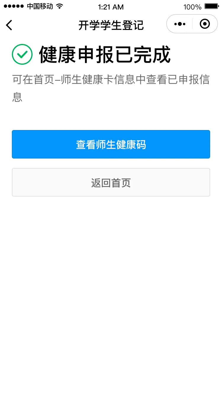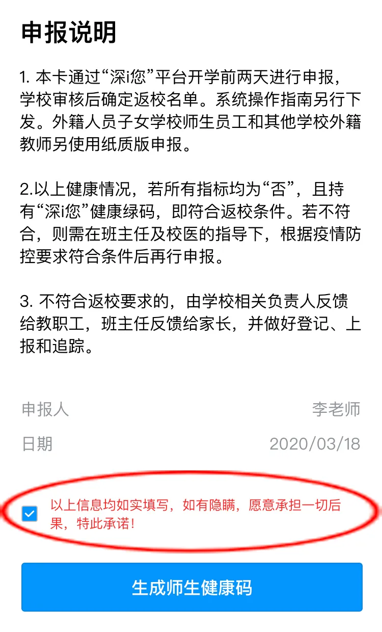 健康信息申报后,请勾选申报承诺,点击“生成师生健康码”即可完成健康申报。