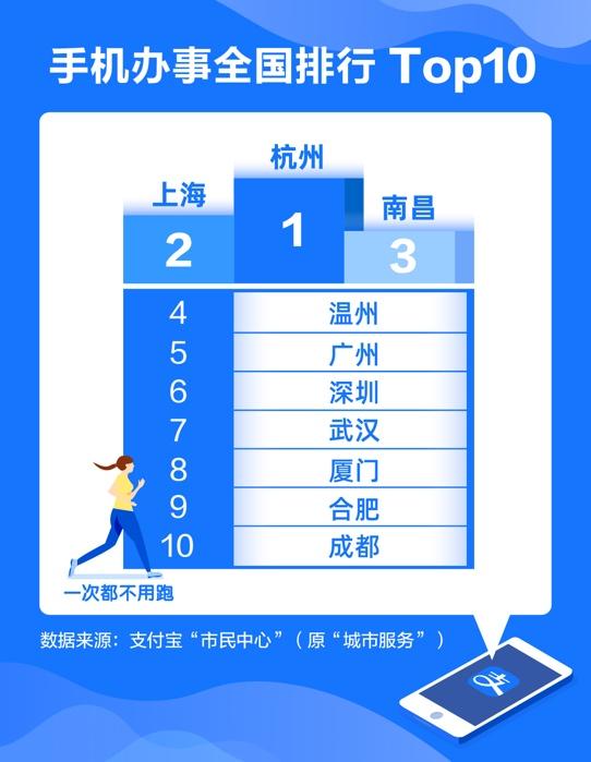4月21日,支付宝“市民中心”发布的全国手机办事排行榜显示,已有超过300城的市民服务能在手机上完成。其中,杭州、上海、南昌等地的市民能在手机上办的事最多。