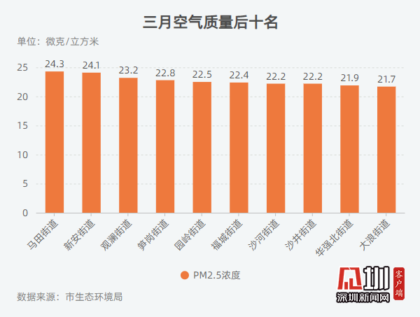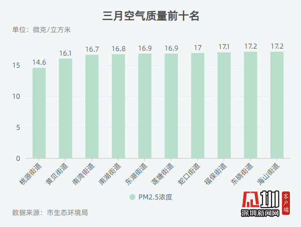 记者从深圳市生态环境局获悉,2020年3月,全市74个街道PM2.5浓度在14.6-24.3微克/立方米之间,均值为19.0微克/立方米。