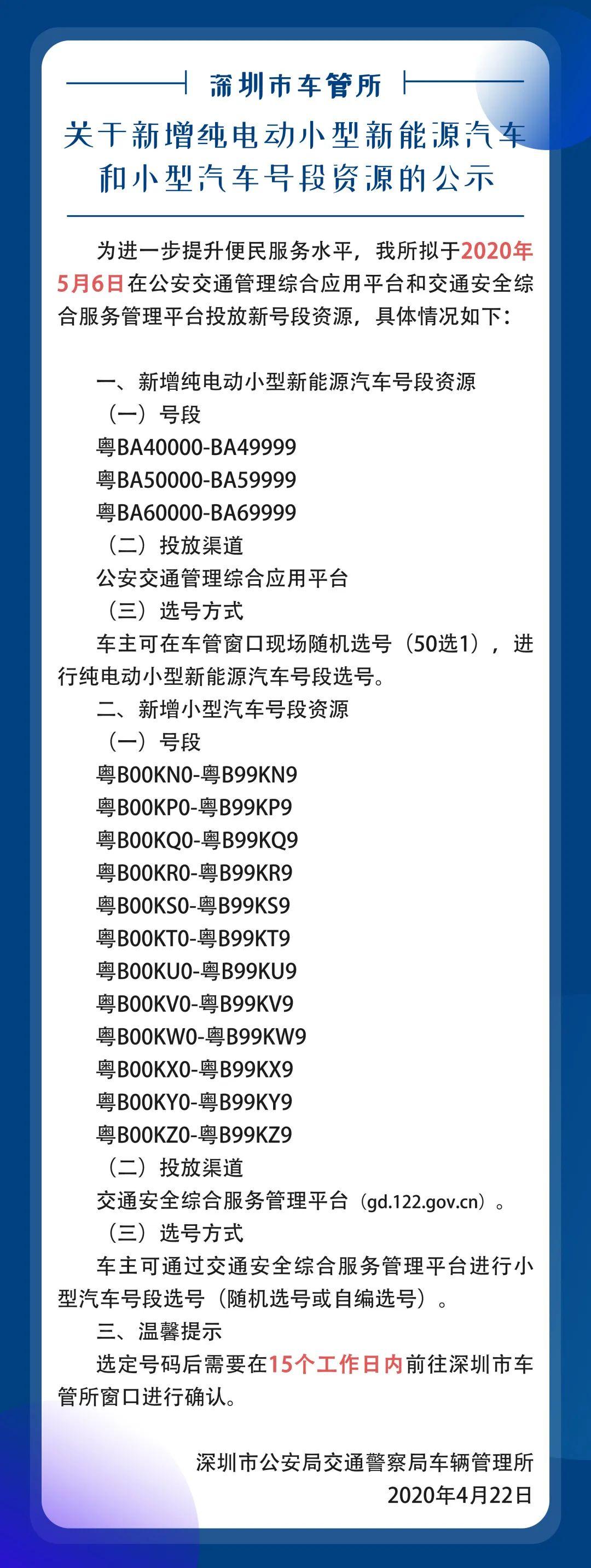 2020年4月23日讯 为进一步提升便民服务水平,深圳市车管所拟于2020年5月6日在公安交通管理综合应用平台和交通安全综合服务管理平台投放新号段资源。具体情况如下: