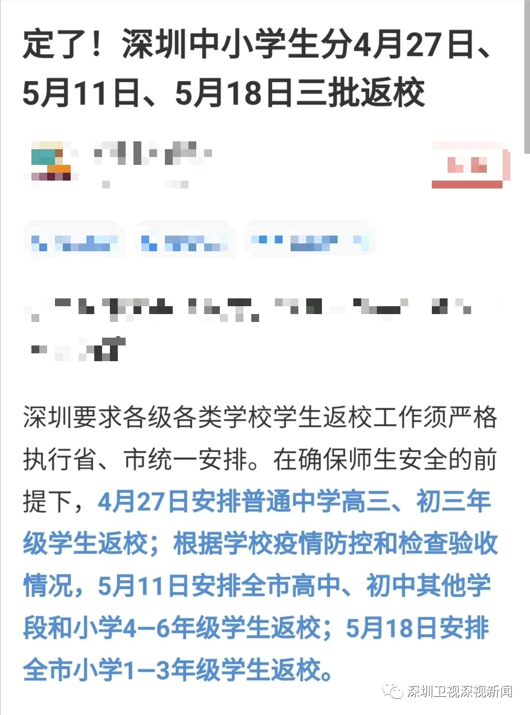 近日,有媒体报道称,深圳中小学生返校时间已确定。5月11日安排全市高中、初中其他学段和小学4—6年级学生返校;5月18日安排全市小学1—3年级学生返校。