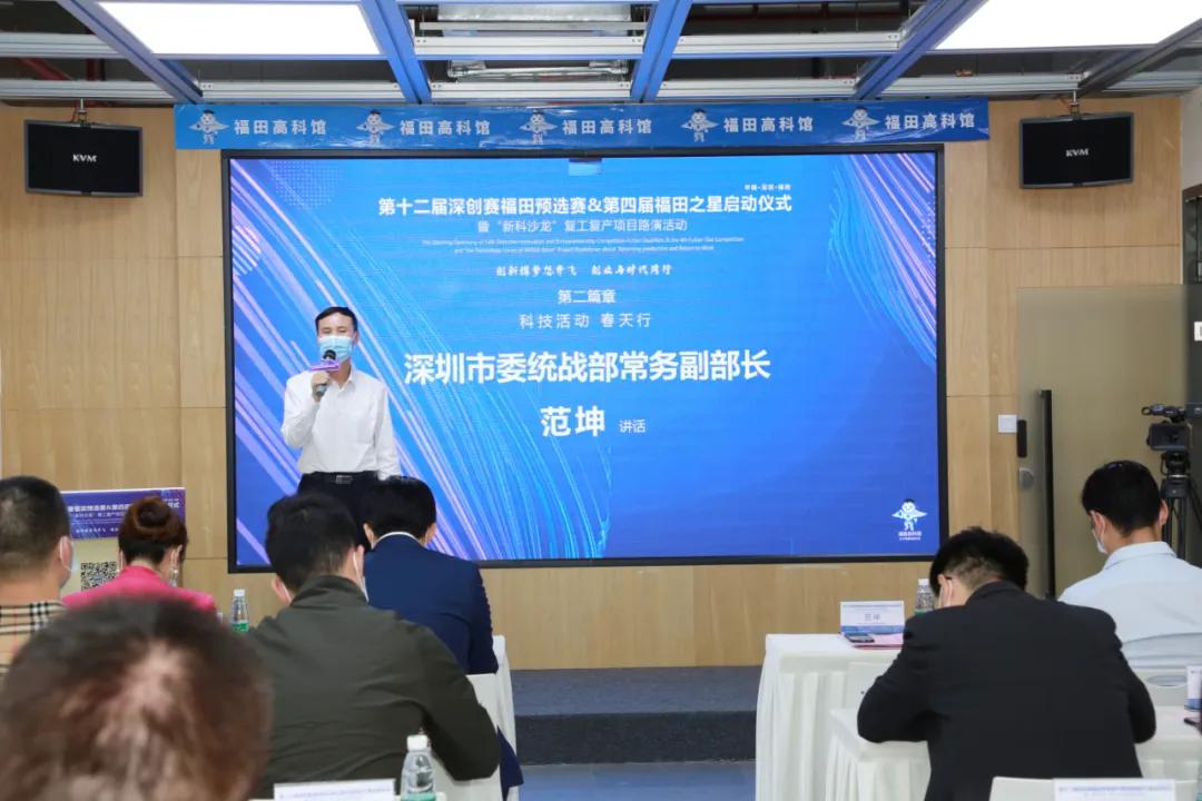 4月23日,由深圳市新联会科技联盟、福田高科馆主办的第十二届深创赛福田预选赛&第四届福田之星启动仪式暨“新科沙龙”复工复产项目路演活动在福田高科馆举行,并进行全程网络同步直播。深圳市委统战部常务副部长范坤出席活动。